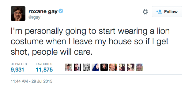 For the past month, I’ve been anxiously following the internet’s response to the death of Cecil the Lion. My attitude has ranged from fascination to horror. I was especially moved by the following tweet by Roxane Gay, author of the NY Times best seller, The Bad Feminist: